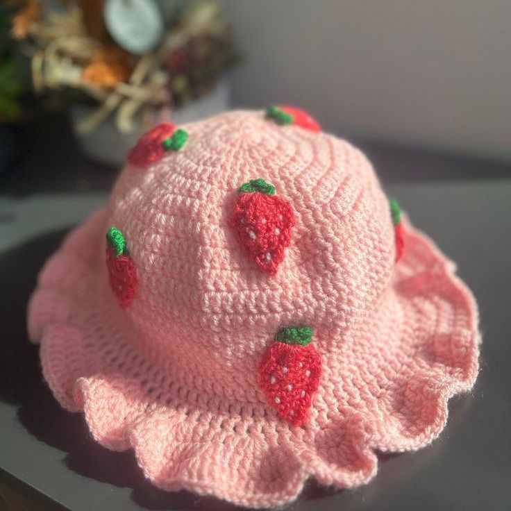 A handmade crochet baby hat with adorable strawberry details, designed to keep little heads cozy and cute.