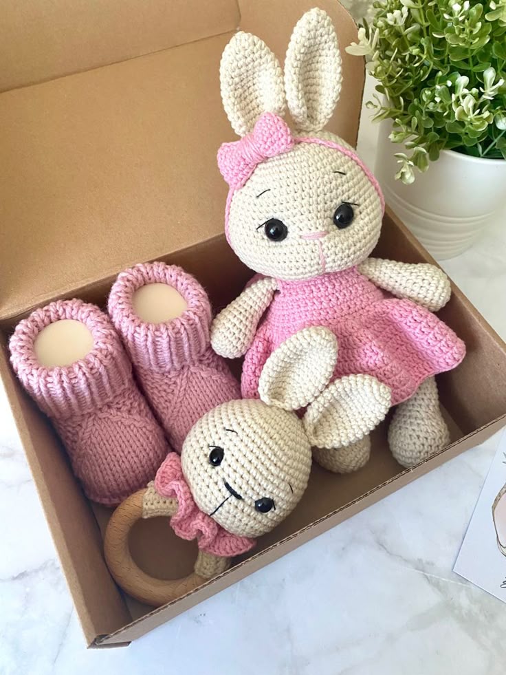 A lovingly handcrafted crochet baby gift set featuring a plush toy, booties, and rattle—perfect for welcoming little ones.